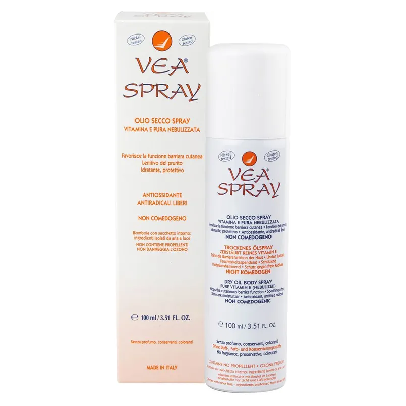 Olio secco spray emolliente, idratante, protettivo, antiossidante, antirughe. Non comedogeno.Favorisce la funzione barriera della cute. Lenitivo del prurito. Protezione dei capelli. Struccante. Post-depilazione. VEA SPRAY è una formulazione assolutamente innovativa: permette di stendere l'olio VEA (Vitamina E acetato allo stato puro) su superfici cutanee molto vaste formando sulla pelle un film sottilissimo di Vitamina E pura. VEA SPRAY può essere applicato anche in assenza completa di toccamento e sfregamento cutaneo. Non contiene acqua, conservanti, profumi e coloranti, per minimizzare i rischi di allergia. Impiegato per la cute secca o arrossata su superfici ampie e su zone pilifere, per la prevenzione della secchezza cutanea, per la protezione della cute sensibile, sottile, come lenitivo del prurito, per la sua azione lipidizzante e contro la secchezza cutanea. Usato regolarmente, può attenuare i fenomeni di invecchiamento cutaneo precoce ed i danni estetici da senescenza per sovraesposizione solare. Viene usato come doposole, come idratante dopo la doccia o il bagno, come olio per massaggi, come dopobarba e struccante (compreso il mascara "water proof"). Può contribuire a prevenire e ad attenuare le smagliature. Si può usare dopo la depilazione, sia per l'azione emolliente sia per l'eliminazione dei residui di "ceretta" e contro la secchezza o arrossamento genitale o perianale, con azione lubrificante. Impiegato anche per la protezione dei capelli, sia normali che secchi, fragili, spezzati o con doppie punte e per la riduzione del volume dei capelli crespi.