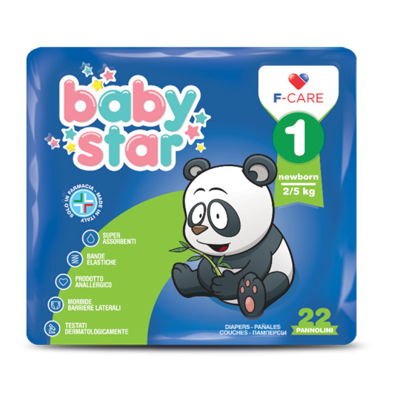 BABYSTAR 22 PANNOLINI TAGLIA 1 NEWBORN 2/5 KG SUPER ASSORBENTI, BANDE ELASTICHE, PRODOTTO ANALLERGICO, MORBIDE BARRIERE L