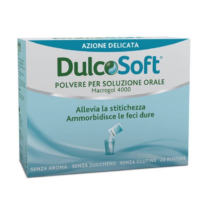 DULCOSOFT POLVERE 20 BUSTINE MACROGOL 400 ALLEVIA LA STITICHEZZA, AMMORBIDISCE LE FECI DURE SENZA AROMA, SENZA GLUTINE, S