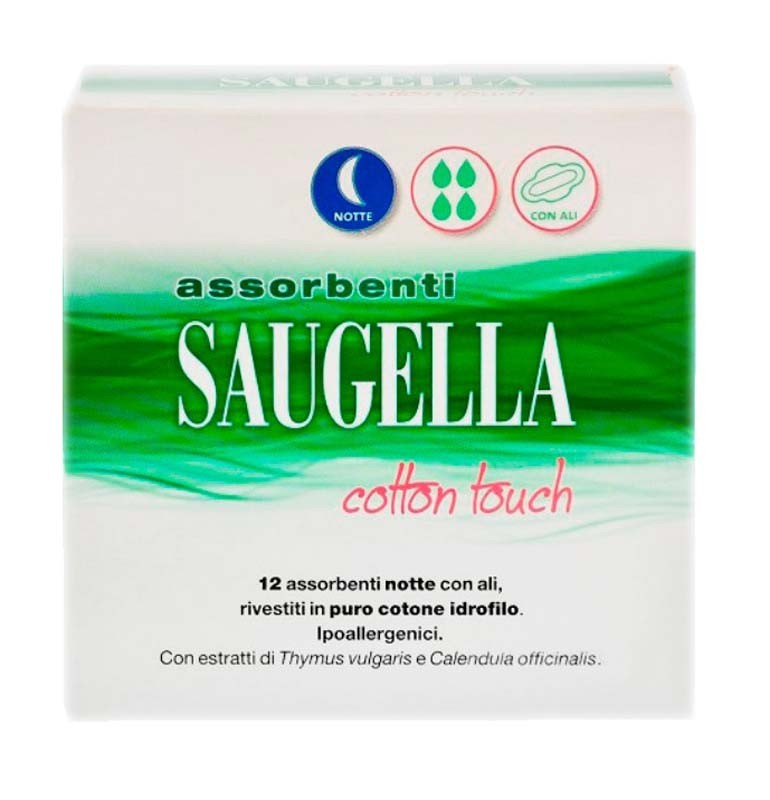 SAUGELLA NOTTE 12 ASSORBENTI NOTTE CON ALI IN PURO COTONE IDROFILO IPOALLERGENICI CON ESTRATTI DI THYMUS VULGARIS E CALEN
