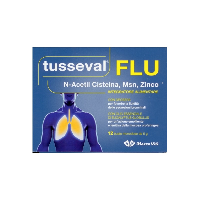TUSSEVAL FLU 12 BUSTINE FLUIDIFICANTE CON N-ACETIL CISTINA 600 MG, MSN, ZINCO CON DROSERA PER FAVORIRE LA FLUIDITÀ DELLE