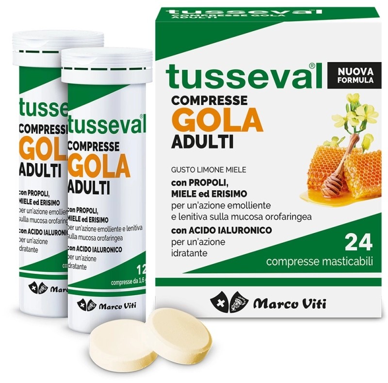 TUSSEVAL GOLA ADULTI 24 COMPRESSE MASTICABILI GUSTO LIMONE E MIELE CON PROPOLI, ERISIMO, MIELE CON AZIONE EMOLLIENTE E LEN