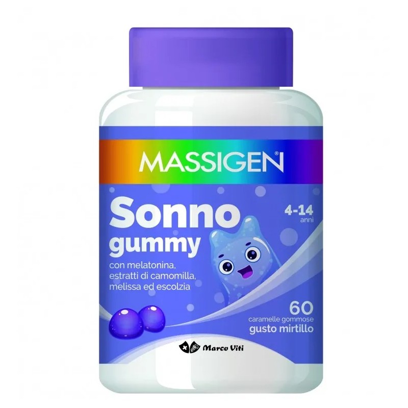 Marco Viti Massigen Sonno Gummy è un integratore alimentare per bambini che contribuisce alla riduzione del tempo richiesto per prendere sonno, Griffonia che favorisce il rilassamento e il benessere mentale e Magnesio che contribuisce al normale funzionamento del sistema nervoso.