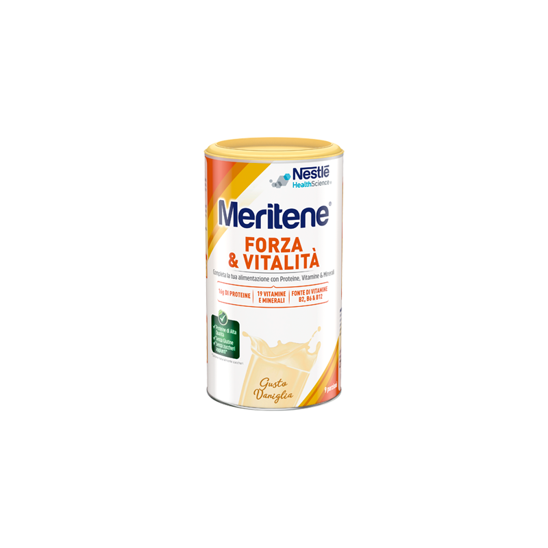 Meritene Forza e Vitalità Polvere gusto vaniglia è un integratore alimentare nato per rispondere ai bisogni degli adulti attivi e formulato per apportare vitamine e minerali importanti per combattere il senso di stanchezza e affaticamento.
