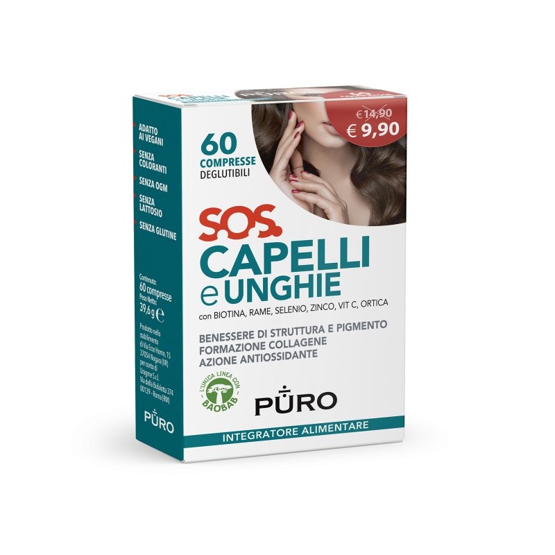 PURO S.O.S. Capelli e Unghie è un integratore alimentare con Baobab, Biotina, Rame, Selenio, Zinco, Vitamina C e Ortica. Utile per capelli sani e unghie più forti, favorisce un'azione antiossidante e aiuta la formazione del collagene. Gli integratori della linea S.O.S. sono gli unici integratori alimentari arricchiti con l'estratto di Baobab. Il Baobab è definito l'Albero della Vita della Madre Terra grazie alle sue molteplici proprietà ed è pertanto considerato uno dei più importanti Superfood naturali. Modo d'uso: assumere una compressa al giorno accompagnata da un bicchiere d'acqua. Confezione da 60 compresse deglutibili. Senza coloranti aggiunti, OGM, lattosio e glutine.