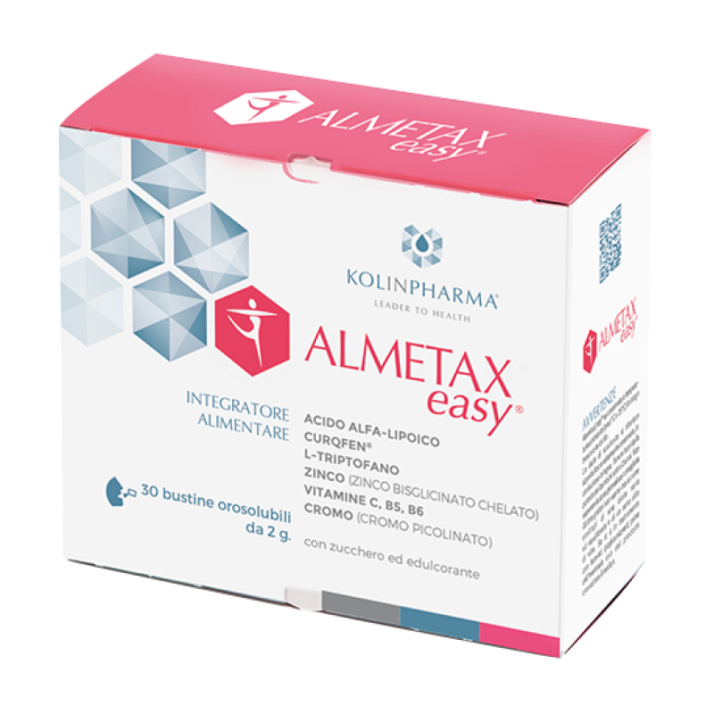Almetax Easy è un integratore alimentare a base di Acido alfa-Lipoico, L-triptofano, Curcuma, Vitamine B5, B6 e C, Cromo picolinato e Zinco, disponibile in comode bustine orosolubili da assumere dopo i pasti principali.