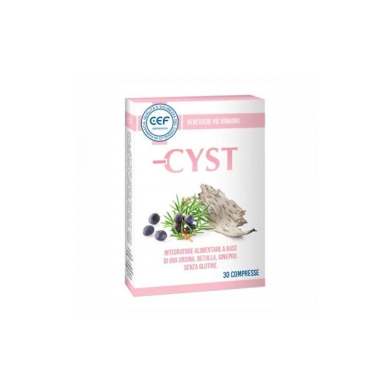 L'integratore alimentare Cyst contenente 30 compresse di CEF, è un prodotto con una formula a base di: uva ursina, betulla, ginepro. L'estratto di uva ursina favorisce la funzionalità delle vie urinarie e la difesa dell'organismo contro gli agenti esterni. La sua azione si espleta su più livelli: calma il bruciore, attenua gli spasmi e dolori e riduce lo stimolo della minzione. La betulla usata in maniera efficiente come diuretico a cui si abbina virtù antinfiammatorie, mentre il ginepro favorisce il drenaggio dei liquidi corporei e la funzionalità delle vie urinarie. Cistite