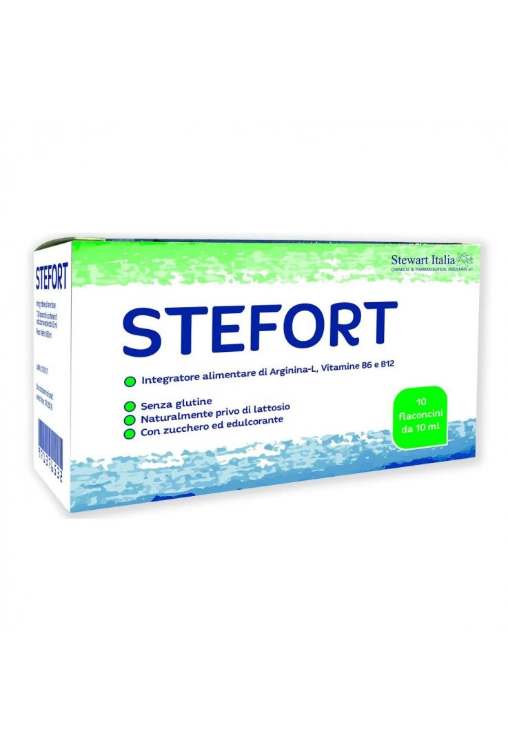 STEFORT SOLUZIONE ORALE 10 FLACONCINI 10ML è un integratore alimentare a base di arginina-L, vitamine B6 e B12, che contribuisce alla regolazione dell'attività ormonale, contenente zucchero ed edulcorante, senza glutine e naturalmente privo di lattosio. Una volta nell'organismo la L-arginina viene convertita in ossido nitrico, una molecola che promuove la dilatazione dei vasi sanguigni, favorendo così un miglior flusso di sangue. Inoltre la L-arginina stimola il rilascio di ormone della crescita, insulina e altre molecole. L’arginina è essenziale per i bambini in fase di crescita e presenta una elevata tollerabilità, motivo per cui è considerata un integratore alimentare sicuro e il suo consumo è ampiamente diffuso in ambito sportivo, e non solo.
