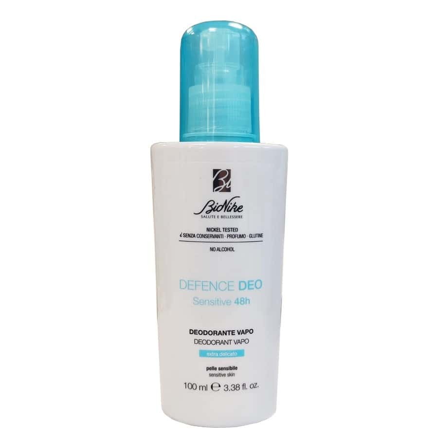 Il deodorante vapo Defence Sensitive da 100ml di BioNike, è un prodotto privo di alcool e profumo e con ingredienti protettivi. Stabilizza la traspirazione, rispettando l'equilibrio della pelle, anche di quella più sensibile nello stesso tempo dona il massimo comfort, tramite un'azione, la cui efficacia è clinicamente testata fino a 48h dall'applicazione.
