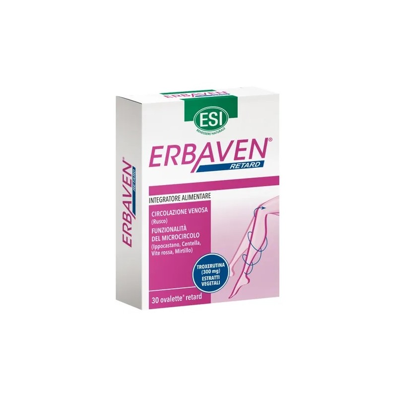 | Erbaven retard ovalette è l’integratore alimentare a base di Troxerutina (flavonoide contenuto in molte varietà di piante, estratto dai fiori di Sophora japonica) ed estratti titolati di Ippocastano, Vite rossa, Centella, Rusco e Mirtillo in grado di stimolare la circolazione sanguigna e linfatica di gambe e piedi, favorendo l’eliminazione dei liquidi accumulati. La speciale formulazione consente una graduale disaggregazione dell’ovaletta lungo il tratto gastroenterico. MODALITÀ D'USO: si consiglia l’assunzione di 1 ovaletta Retard al giorno da deglutire con abbondante acqua.