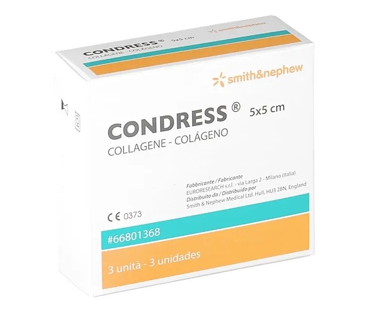 Le medicazioni CONDRESS, costituite da puro collagene liofilizzato eterologo nativo di tipo 1 di origine equina (estratto dal tendine di cavallo), contribuiscono ad accelerare il processo di guarigione delle lesioni cutanee croniche, ferite acute e traumatiche.4