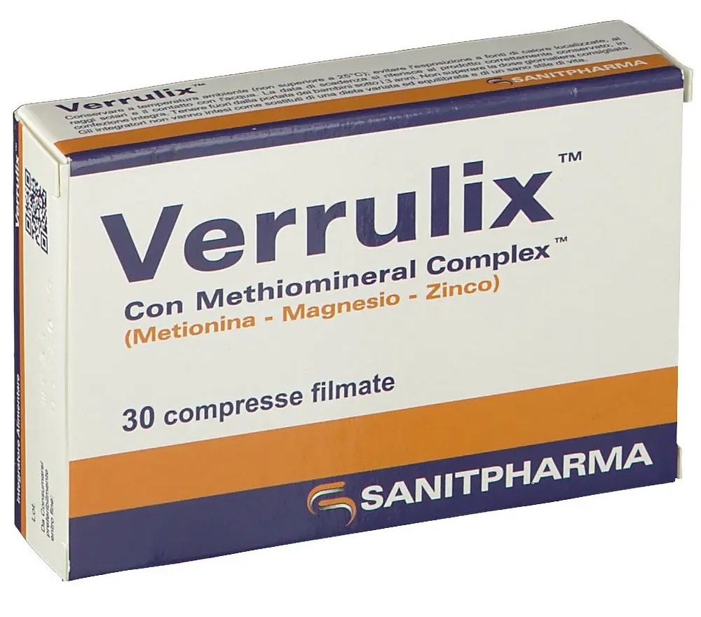 Verrulix Compresse è un integratore alimentare a base di una miscela di Metionina e Sali Minerali (Methiomineral complex) con Vitamina B6 e Zinco, che possono essere utili a favorire il trofismo dell’epidermide e a coadiuvare le difese immunitarie impegnate nel proteggerla dagli attacchi esterni. L'integratore Verrulix, grazie alla sua miscela di Metionina e sali minerali, aiuta l'organismo a proteggersi dagli attacchi di agenti esterni tra cui condilomi, verruche, pitiriasi versicolor, ragadi, mollusco contagioso, rafforzando così le difese immunitarie che favoriscono il trofismo dell'epidermide.