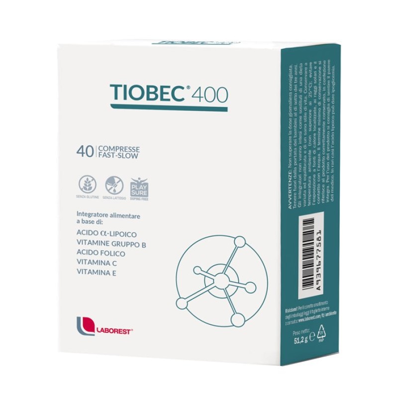 Integratore alimentare Tiobec 400 a base di Acido a-lipoico (acido tiottico), Vitamine del gruppo B, Vitamina E e Vitamina C.