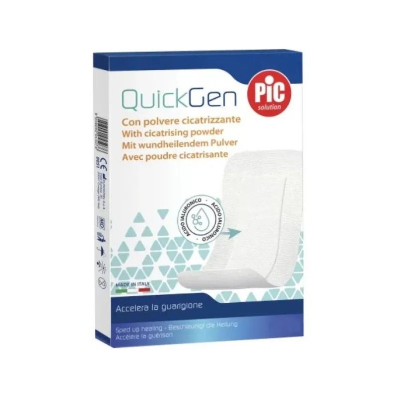 Pic QuickGen Cerotto Cicatrizzante 10 X 12 Cm 5 Pezzi Protegge la ferita e ne accelera il processo di guarigione grazie all'acido ialuronico contenuto nel tampone.