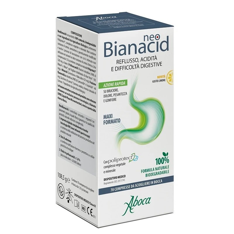NeoBianacid è indicato per il trattamento del reflusso gastroesofageo e del dolore di stomaco (dispepsia dolorosa), caratterizzati da rigurgito acido, bruciore, dolore, tosse irritativa, disfonia.