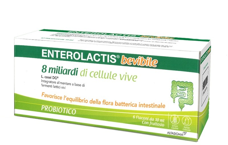 Enterolactis Bevibile Flaconcini Integratore Fermenti Lattici Vivi 6x10ml è un integratore alimentare che contiene fermenti lattici vivi (Lactobacillus casei DG) utili per riequilibrare la flora batterica intestinale. Può essere utile in caso di disturbi intestinali, uso di antibiotici, viaggi, stress o alimentazione scorretta.