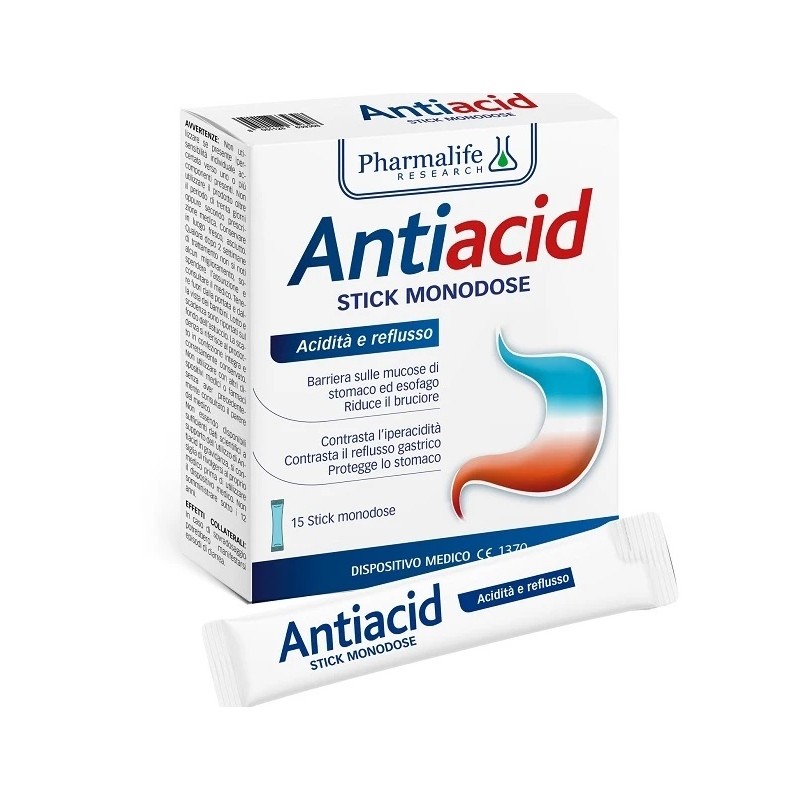 Pharmalife Research AntiAcid è un dispositivo medico formulato per il trattamento del reflusso gastroesofageo e dei sintomi correlati, come esofagite da reflusso, bruciore di stomaco (pirosi), rigurgito acido e tosse irritativa. La sua efficacia è garantita da un meccanismo d'azione duplice: