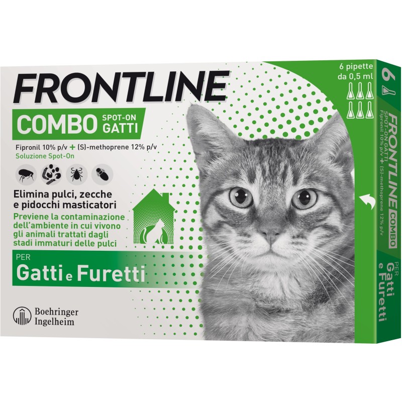 FRONTLINE COMBO ANTIPARASSITARIO SPOT-ON GATTI UCCIDE PULCI, ZECCHE E PIDOCCHI MASTICATORI PREVIENE LA CONTAMINAZIONE DEL