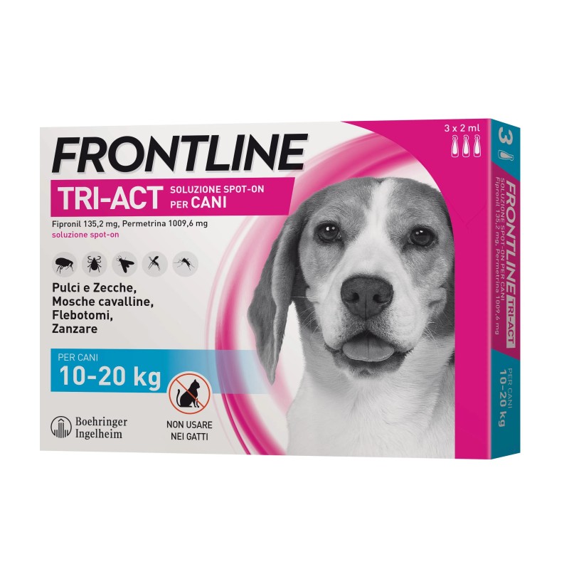 Frontline tri-act 3 pipette 2 ml 10-20 kg per il trattamento e la prevenzione di infestazioni da pulci e/o zecche ove sia necessaria l’attività repellente (anti-feeding) nei confronti di flebotomi, mosche cavalline e/o zanzare.